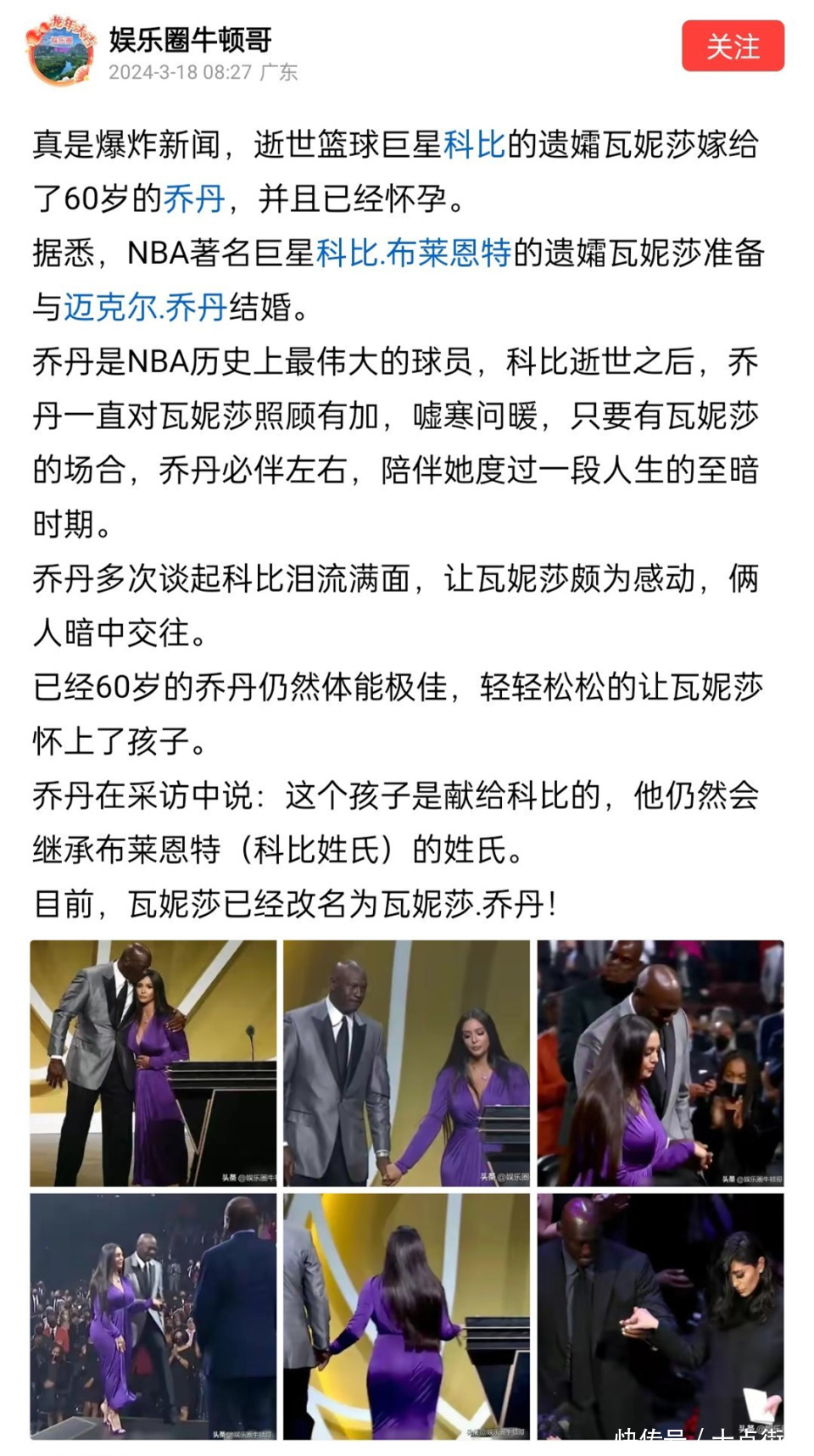 北京时辰3月18日,科比遗孀“瓦妮莎”的名字一刹冲上了中国外交媒体热搜榜榜首,而看完对于瓦妮莎的这条音问本色之后,更是让东谈主感到张目结舌,一位名叫“文娱圈牛顿哥”的博主撰文宣称,如故毕命的科比遗孀瓦妮莎准备嫁给了60岁的乔丹,况兼如今已怀上了身孕!深信大部分球迷看到这条音问的第一响应开云炸金花,皆备是难以置信,那么很快,对于此音问的真相来了